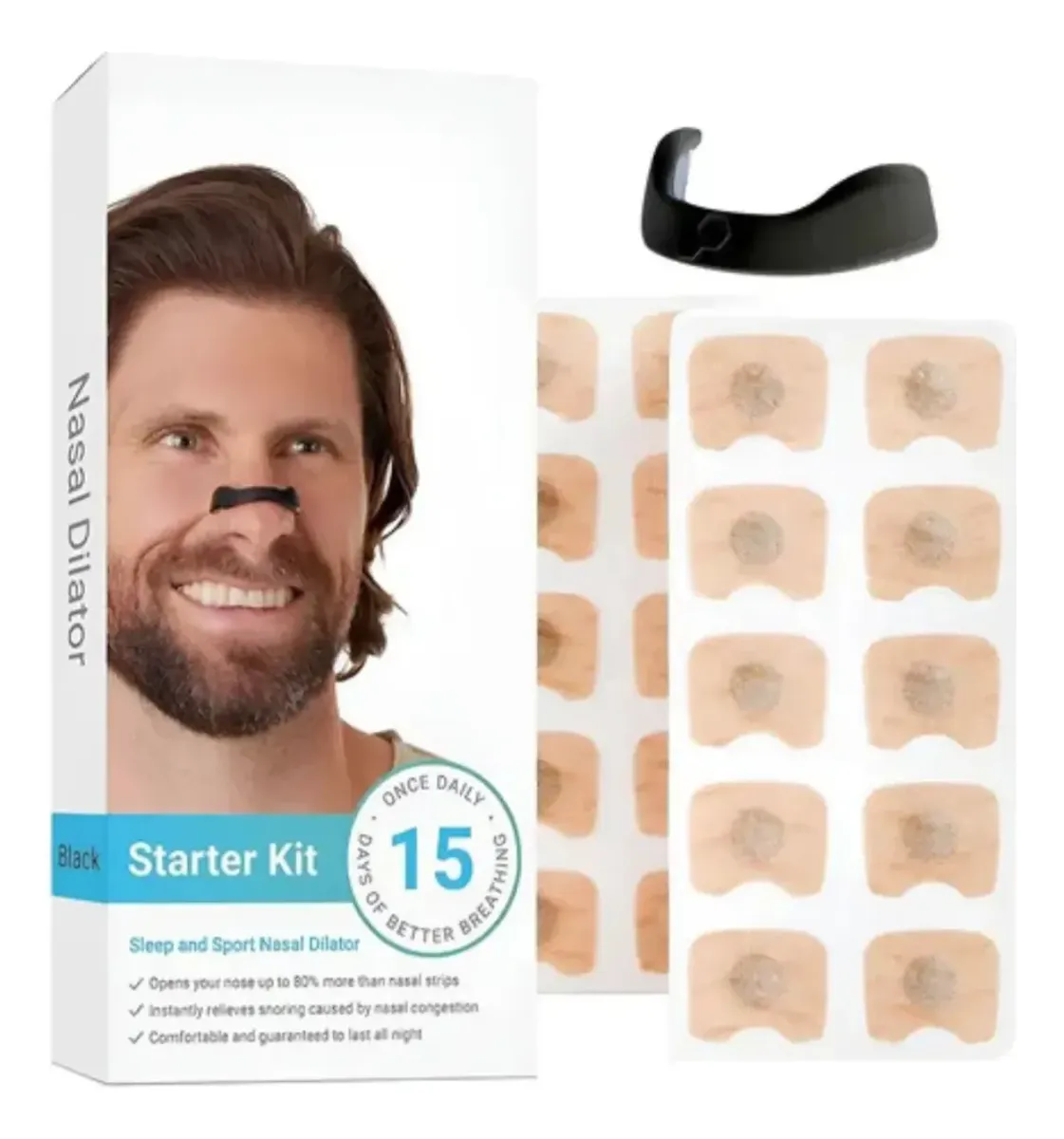 KIT DE TIRAS NASALES. Se trata de un sistema de expansión de las fosas nasales en dos partes con dos tiras nasales independientes y una banda de liberación magnética duradera que funcionan juntas para abrir las fosas nasales con el ancho más amplio posible. El diseño proporciona un flujo de aire óptimo y un ajuste cómodo y personalizado para cada usuario.